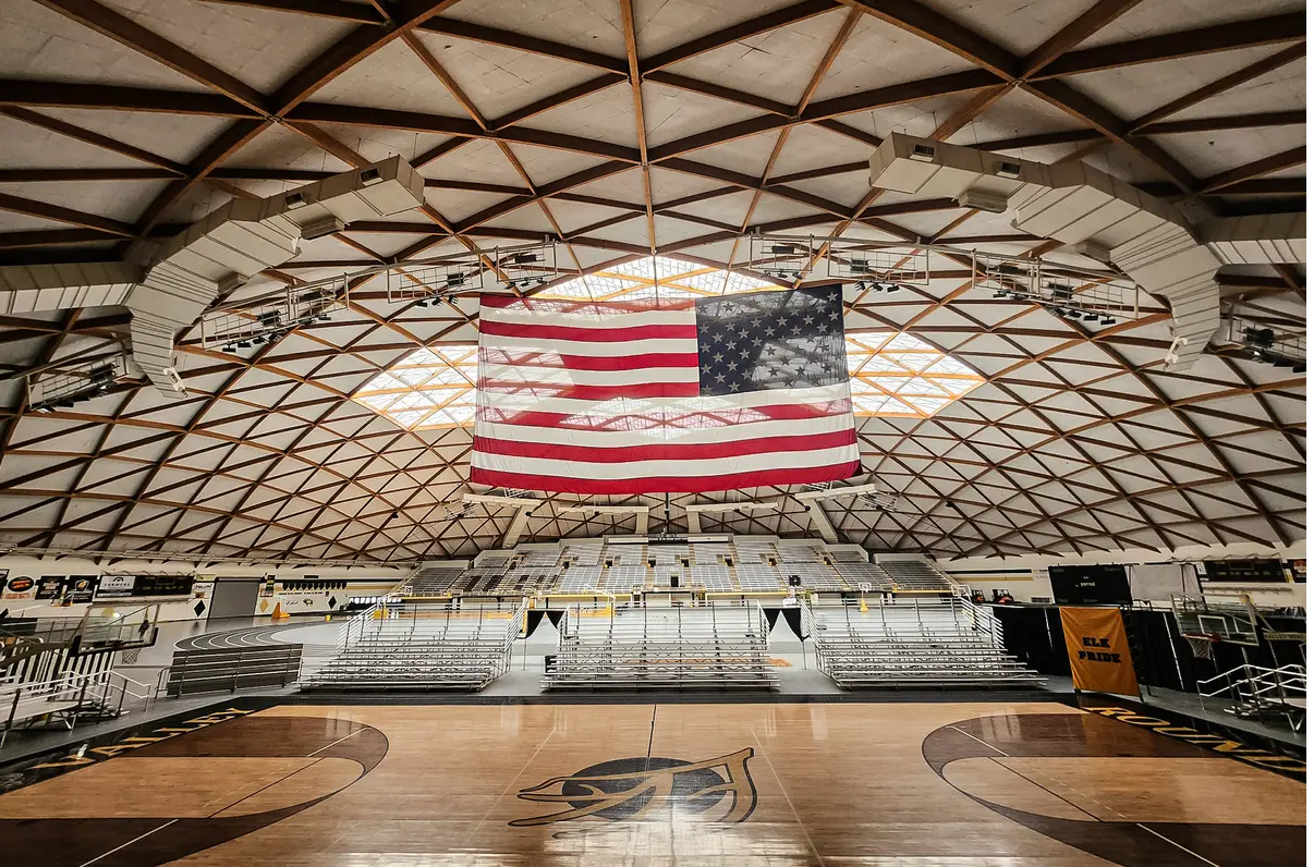 The stadium looks like a giant flying saucer landed in the middle of horse and cattle country. It’s a massive wooden-dome stadium that can seat 5,500 spectators in bleachers away from the elements.