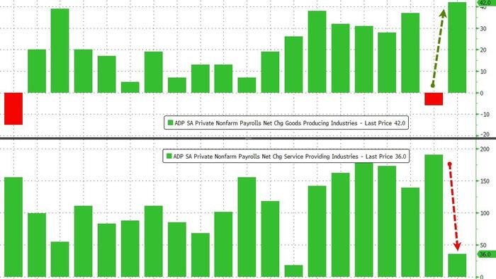 Perhaps more odd still is the fact that goods-producing firms saw a huge jump in job additions (Trump driving confidence in manufacturing with the biggest addition since Oct 2022) while Services was job additions tumble…