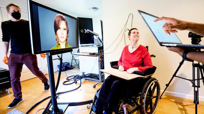 To give Johnson an embodied experience, researchers had her choose from a selection of avatars, and they used a recording of her wedding speech to recreate her voice. An implant plugged into a computer nearby rested on top of the region of her brain that processes speech, acting as a kind of thought decoder. Then they showed her sentences and asked her to try to say them.