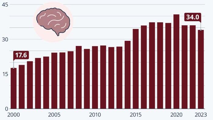 As Statista’s Anna Fleck shows in the chart below, where an average of 17.6 people per 100,000 died from the form of dementia at the turn of the millennium, the figure had climbed to 34 per 100,000 people as of 2023.