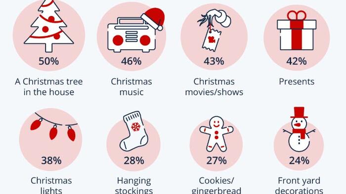 According to Statista Consumer Insights, a Christmas tree in the house tops the list of holiday must-haves this year, with 50 percent of Americans considering it essential to a proper celebration.