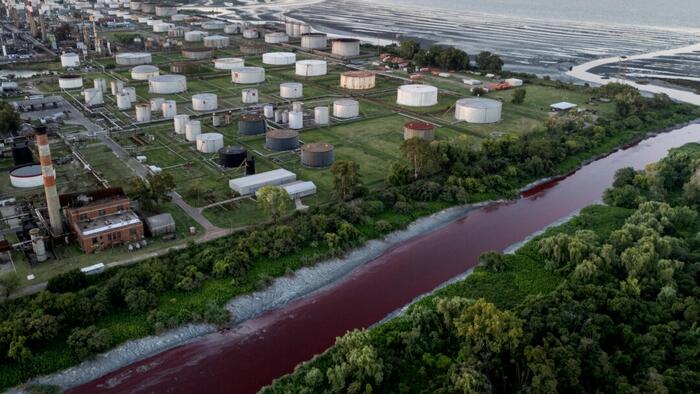 The Sarandí stream that winds through the dense outskirts of Buenos Aires, Argentina, has recently turned blood red, leading to fears of a potential industrial chemical leak.