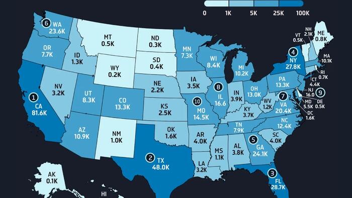 While California dominates in total jobs, Washington ranks first on a per capita basis, with 289.8 roles per 100,000 residents. This is partially thanks to being home base to companies like Microsoft and Amazon.