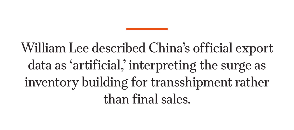 Lee described China’s official export data as “artificial,” interpreting the surge as inventory building for transshipment rather than final sales. In other words, those goods may have crossed China’s borders but are still in transit, looking for end buyers.