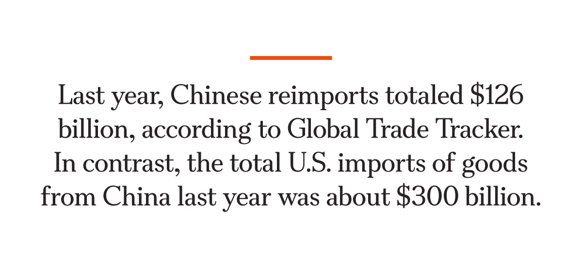 Last year, reimports, or goods that were previously exported and then returned to China, totaled $126 billion, according to Global Trade Tracker. In contrast, U.S. imports of goods from China in 2025 totaled about $300 billion.