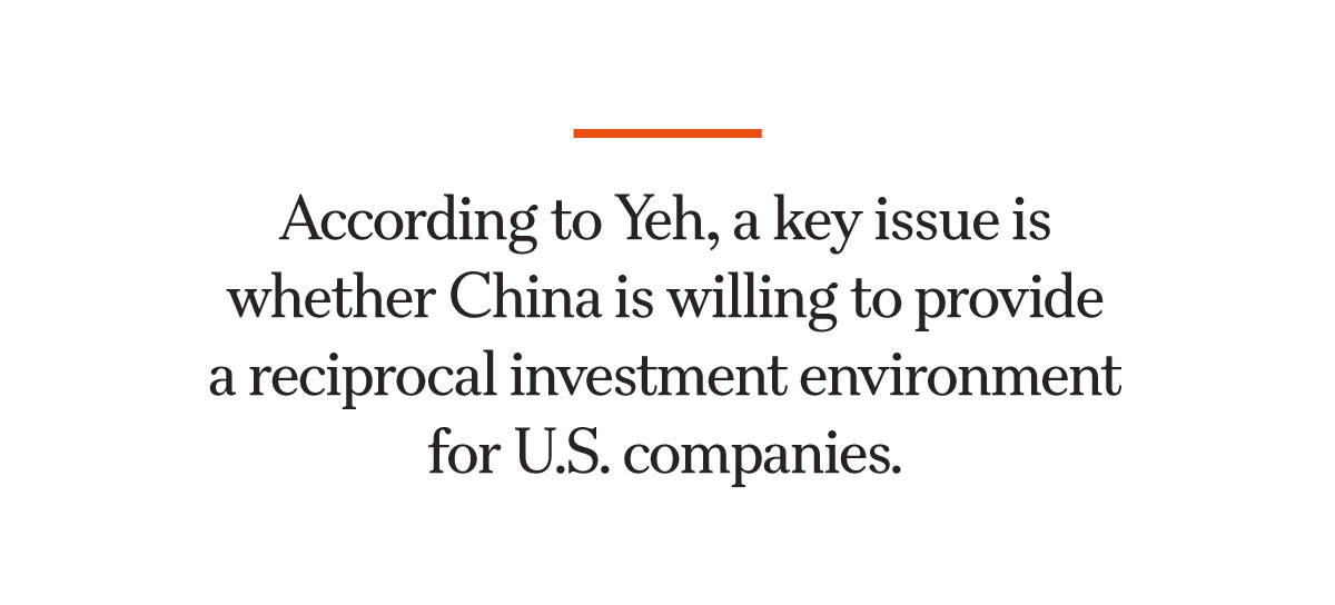 According to Yeh, a key issue is whether China is willing to provide a reciprocal investment environment for U.S. companies.