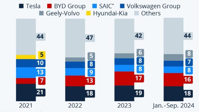 Between 2023 and January to September 2024, BYD’s and Tesla’s shares dropped by 1 percentage point each. BYD is focused on providing BEVs to a more general consumer base, while Tesla’s products have a higher price tag. This difference might be slightly mitigated through the increase of tariffs on Chinese-made cars from 25 to 100 percent which came into effect in August 2024.