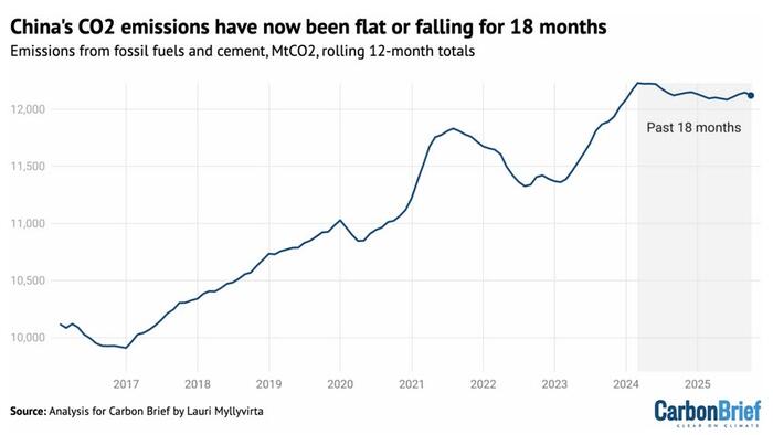 China has seen its carbon dioxide (CO2) emissions keep a flat or falling trend for 18 consecutive months as electric vehicles and renewable energy uptake soars, a new analysis for Carbon Brief showed on Tuesday.