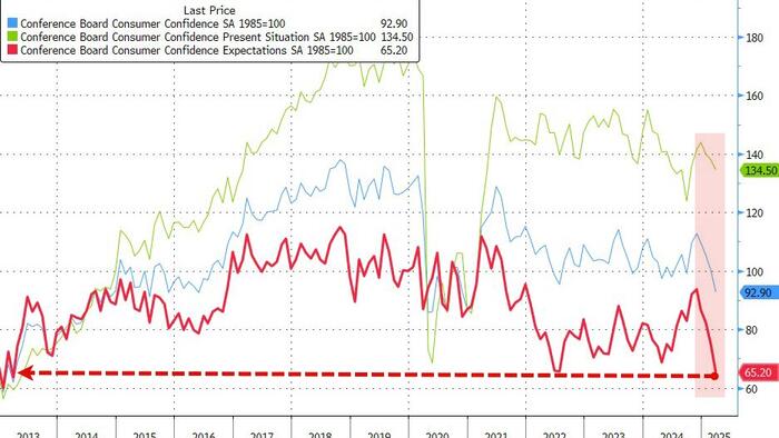 The Conference Board Consumer Confidence headline print fell from 100.1 (upwardly revised) to 92.9 (below 94.0 exp). Under the hood, it was not pretty with the measure of expectations for the next six months dropped nearly 10 points to 65.2, the lowest in 12 years, while a gauge of present conditions declined more modestly.