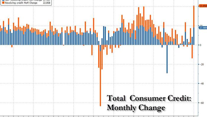 Taking a closer look at the number, while non-revolving debt (i.e. student and auto loans) rose modestly as it always does rising by $18 billion, it was revolving, or credit card debt, that cratered soared by a whopping $22.3 billion, a remarkable reversal to the $14 billion drop in November which was the biggest drop since the covid crash shut down the economy, and the biggest monthly increase on record.