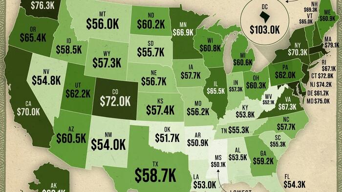 Other low-earning states include Arkansas ($50,899), Oklahoma ($51,676), West Virginia ($52,080), and Louisiana ($52,959). Many of these states are concentrated in the South, reflecting broader regional wage gaps tied to industry mix, job availability, and cost of living.