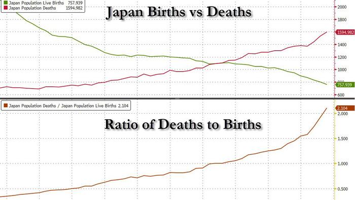 At the same time, the number of deaths hit a record just above 1.6 million, pushing the ratio of deaths to births above a shocking 2x for the second straight year, virtually guaranteeing demographic doom for Japan.