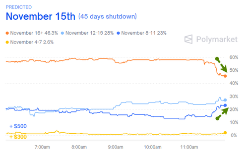 Update (1440ET): It appears we may be close to a resolution to reopen the government – as Senate Minority Leader Chuck Schumer is reportedly about to make an offer: Extend Obamacare enhanced subsidies for one year in exchange for their votes, according to Punchbowl News‘ Max Cohen.
