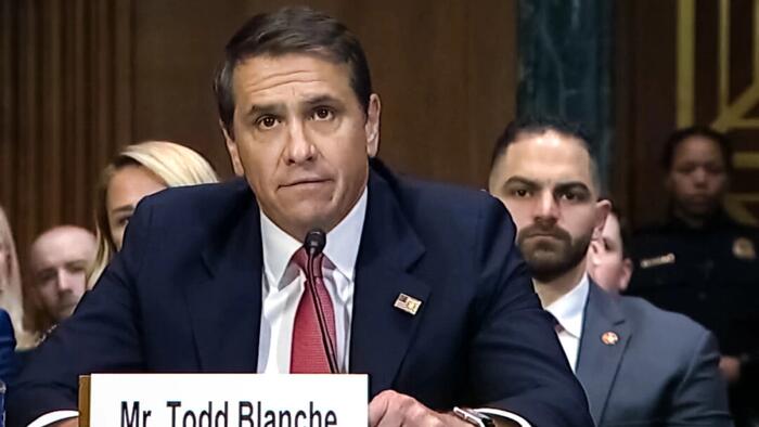 In this image from video, Todd Blanche testifies during his confirmation hearing in Washington on Feb. 12, 2025. He was later confirmed as deputy attorney general. The Epoch Times via Senate Judiciary Committee