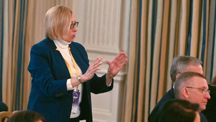 Maine Gov. Janet Mills speaks with President Donald Trump at the Governors Working Session in the State Dining Room of the White House in Washington on Feb. 21, 2025. Jim Watson/AFP via Getty Images