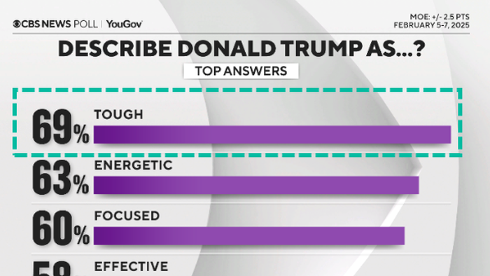 A new CBS News/YouGov survey of 2,175 US adults interviewed last week found President Trump to be “tough,” “energetic,” “focused,” and “effective” in his first few weeks in office.