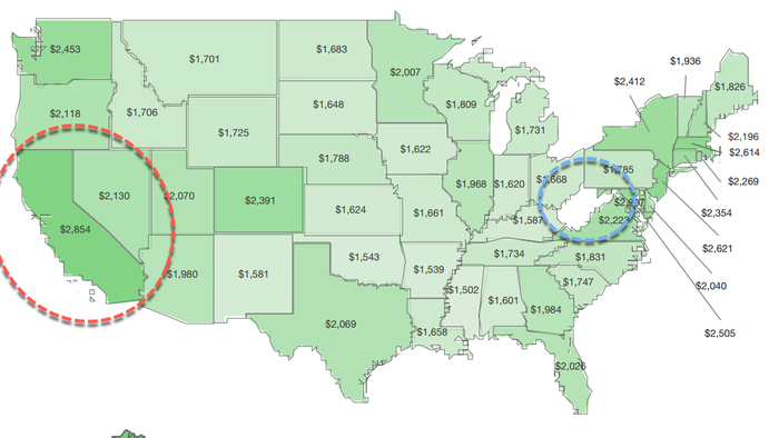 Californians face a median monthly bill of $2,854, 39% above the national level, compared with $1,149 in West Virginia, 44% below. The report, based on median payments for 13 major household expenses including mortgages, rent, utilities, auto loans, insurance and telecoms, ranks all 50 states by bill cost.