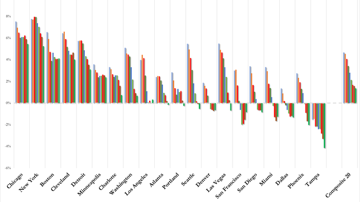 At the opposite extreme, Tampa posted a 4.1% annual decline – the sharpest drop among tracked metros and its 11th consecutive month of negative annual returns. Phoenix (-2.0%), Dallas (-1.3%), and Miami (-1.3%) likewise remained in negative territory, highlighting particular weakness in Sun Belt markets that experienced the most dramatic pandemic-era price surges.