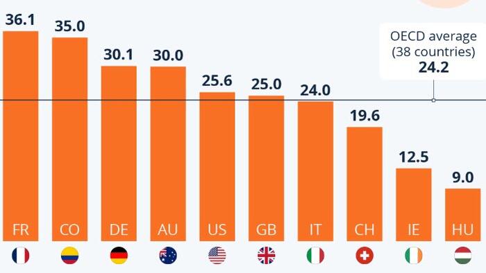 As Statista’s Tristan Gaudiant details below, using the organization’s data, France maintains the highest combined corporate tax rate in the OECD, at 36.1 percent in 2025, followed by Colombia (35 percent), while the lowest marginal corporate tax rate is found in Hungary, at 9 percent, followed by Ireland (12.5 percent).