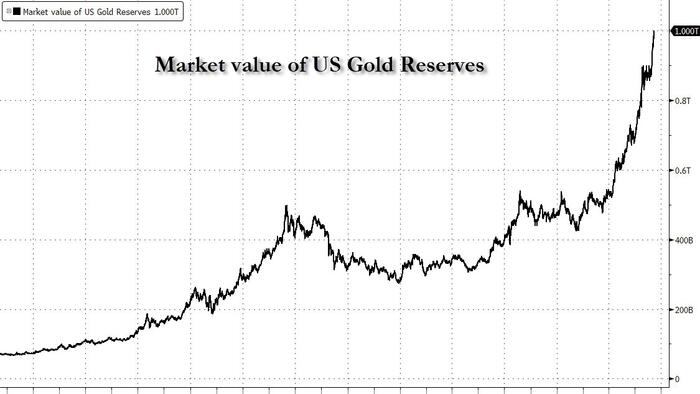 On the back of a 45% surge in the price of gold this year, the US Treasury’s hoard of the barbarous relic has surpassed $1 trillion in value for the first time in history.