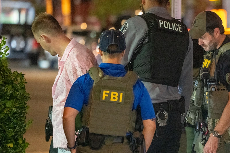 Videos shared on social media show an agitated man in a pink polo shirt and light shorts speaking to a small group of agents on a sidewalk, while holding a wrapped Subway sandwich in one hand.