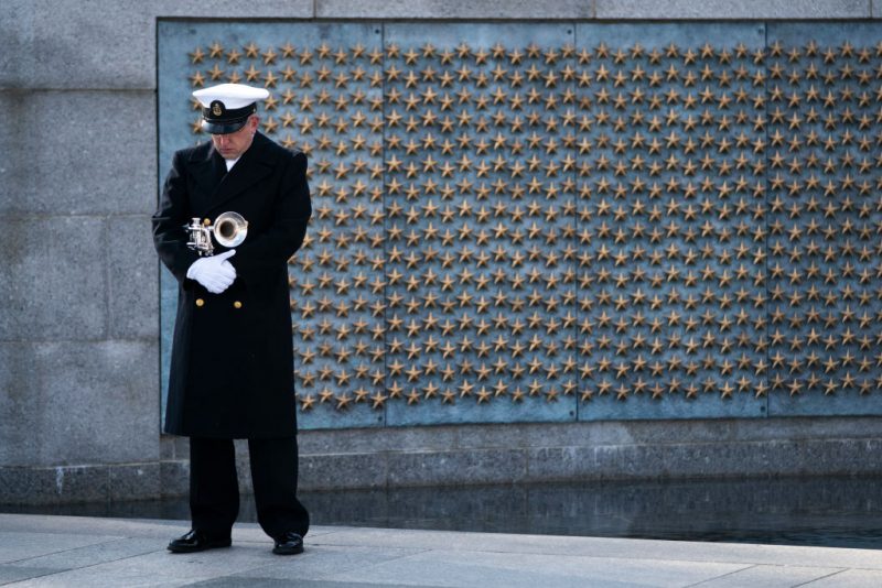 A trumpeter with a military honor guard pauses at the World War II Memorial during a wreath-laying ceremony. (Photo by Drew Angerer/Getty Images)