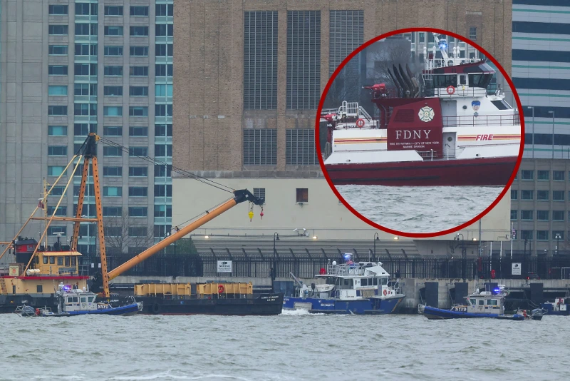 (L) Rescue boats are seen in Hoboken, New Jersey, after a helicopter crashed into the Hudson River on April 10, 2025. (Photo by CHARLY TRIBALLEAU/AFP via Getty Images) / (R) A New York Fire Department rescue boat is seen in Hoboken, New Jersey, after a helicopter crashed into the Hudson River on April 10, 2025. (Photo by CHARLY TRIBALLEAU/AFP via Getty Images)