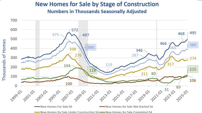 New home sales are seasonally adjusted and annualized totals. The stage of construction numbers are seasonally adjusted but not annualized.