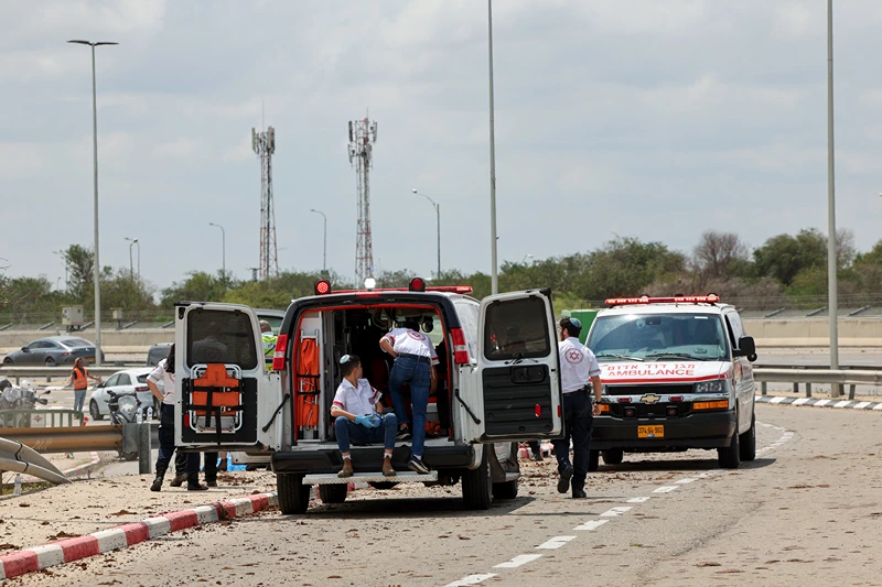Israeli medical emergency services stand by on a mud-splattered road outside Israel’s Ben Gurion airport after a missile struck near the facility on May 4, 2025. (Photo by JACK GUEZ/AFP via Getty Images)