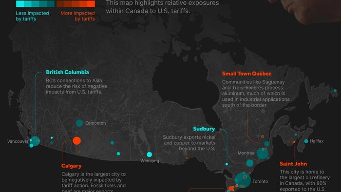 This map, via Visual Capitalist’s Nick Routley, with data from the Canadian Chamber of Commerce Business Data Lab (BDL), is an overview of which Canadian cities are likely to be the hardest hit by tariffs.