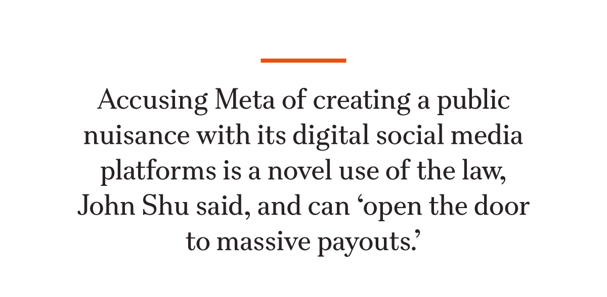 Accusing Meta of creating a public nuisance with its digital social media platforms is a novel use of the law, Shu said.