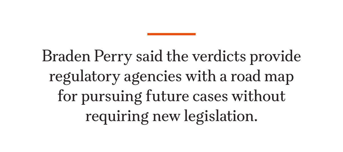 Braden Perry, a government investigations and corporate litigation attorney, said the verdicts provide regulatory agencies with a road map for pursuing future cases without requiring new legislation.