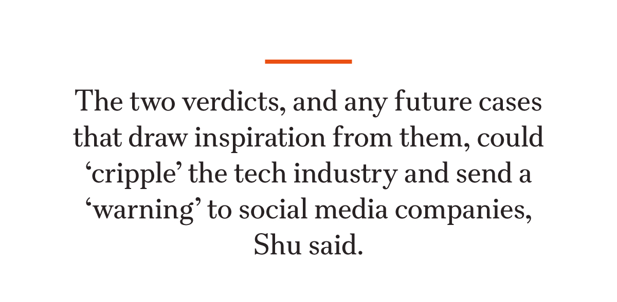 The two verdicts, and any future cases that draw inspiration from them, could “cripple” the tech industry and send a “warning” to social media companies, Shu said.