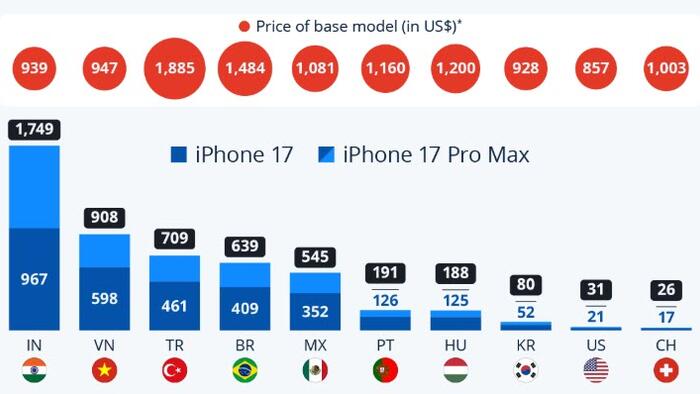 In addition to high import duties levied by both Brazil and Turkey, extra costs are incurred by logistics security in the case of Brazil and luxury taxes applied in the case of Turkey. Weak currencies also add to operational uncertainty for Apple, which can manifest itself in price politics. The high retail price of the iPhone in both of these countries contributes to the fact that its local equivalent in average gross pay work hours is between 409 and 461 for a base model iPhone 17 and between 639 and 709 hours for a standard iPhone 17 Pro Max.