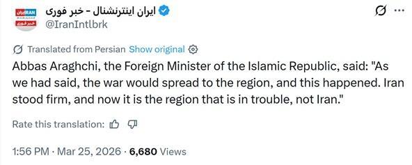 - Iran’s foreign minister says US has failed in its war goals including quick victory and change of regime; message to the neighboring countries, distance yourself from the US; No talks with the US