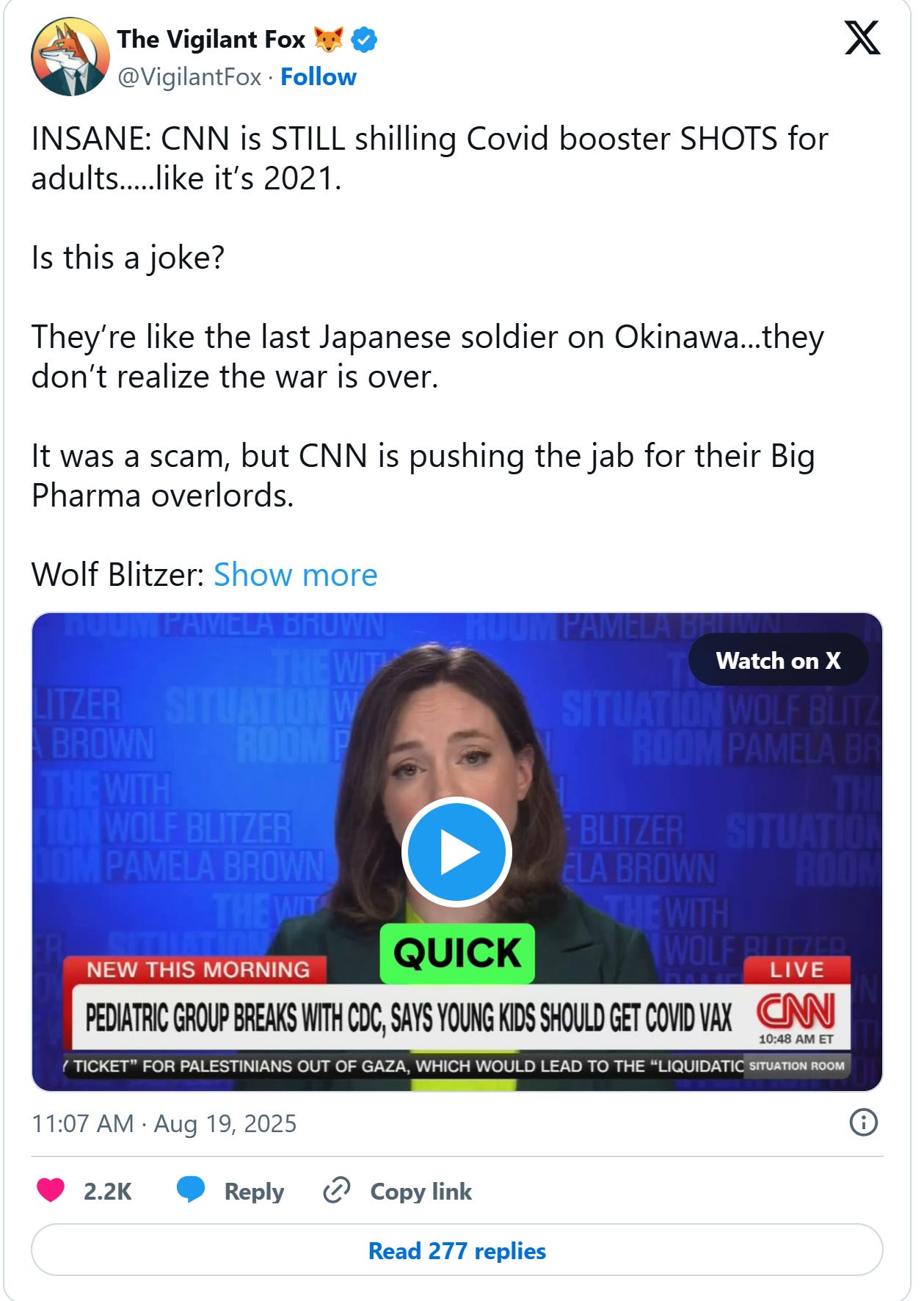 In 2025—long after respected studies have shown that repeated COVID boosters carry serious risks like myocarditis and do not prevent you from getting the virus—CNN is still promoting the shots. Host Wolf Blitzer even asked a colleague on-air, “When should adults start getting the Covid vaccine booster shots, and when should we start getting the flu shots?”
