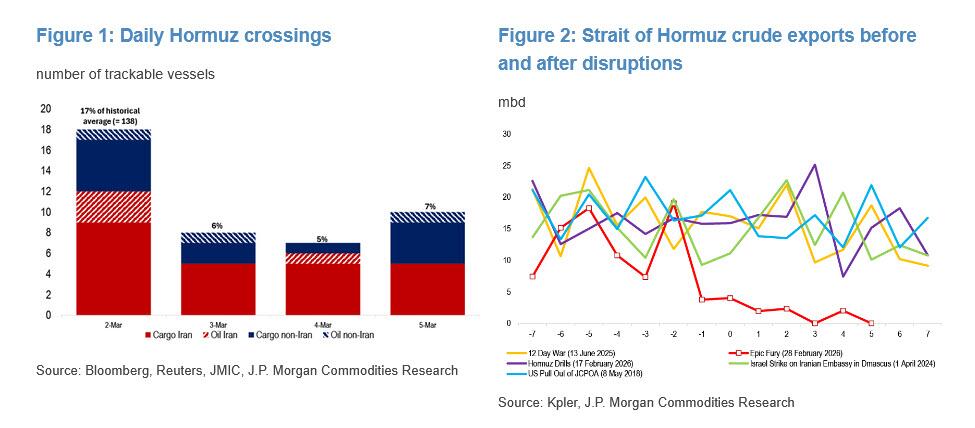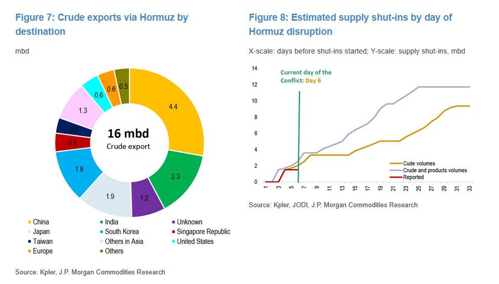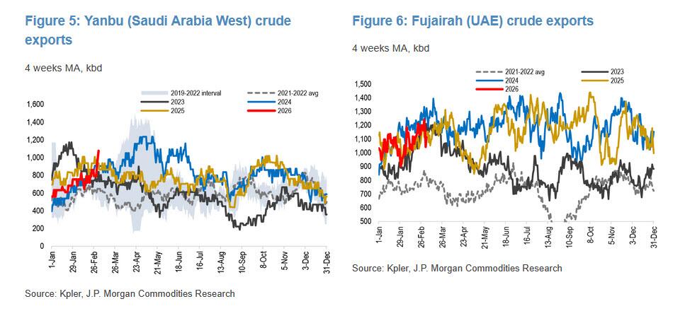 Kuwait is likely next to curtail upstream supply following today’s run cuts: based on current flows, JPM estimates about four days until shut‑ins begin, or up to nine days if product storage remains available. Beyond Kuwait, the first signs of supply constraints in the UAE should emerge next week.