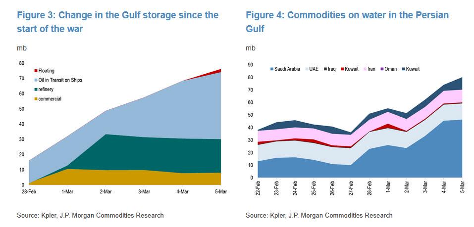 Unable to move crude through the waterway, JPM reminds its clients that producers have effectively shifted storage onto the sea and other facilities. Since the end of February, roughly 76 million barrels (mb) of crude have accumulated—about 46 mb on tankers, 22 mb at refiners, and 8 mb in commercial storage, or about 4.5 days of regional crude exports; most of the inventory build appears to be concentrated in Saudi Arabia.