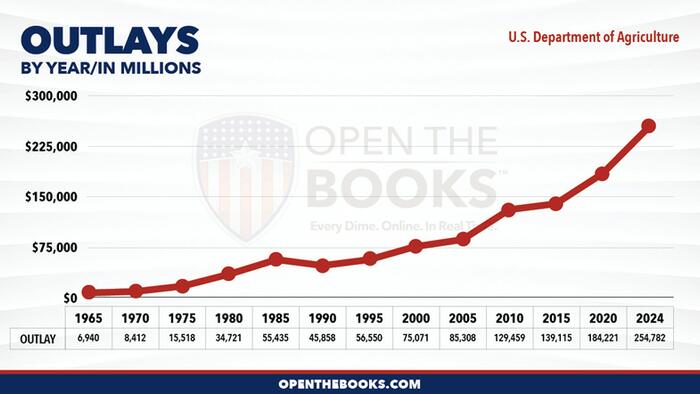 The US Department of Agriculture (USDA) is a perfect example of the staff vs. spending pattern. Since 2000, employee counts shrank from 106,715 to 92,072 in 2024. But annual spending skyrocketed in the same period: in 2000, it was $75.07 billion; by 2024, $254.78 billion – 339% higher.