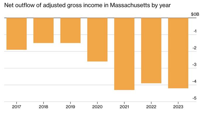 In 2023, the first year the surtax took effect, Massachusetts experienced a net outflow of $4.2 billion in adjusted gross income. That number increased eight percent from the prior year. This was not driven by a sudden collapse in population or some unrelated shock. It reflects a steady and measurable movement of income and the people who earn it out of the state. Even more telling is that this shift occurred despite the fact that overall migration patterns did not dramatically worsen. In other words, fewer people may have left, but those who did leave took significantly more income with them.