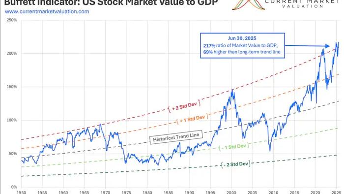 Valuations are stretched to extremes. The Buffett Indicator, the ratio of total market cap to GDP, sits above 217%, exceeding even the dot-com bubble’s peak near 150%.