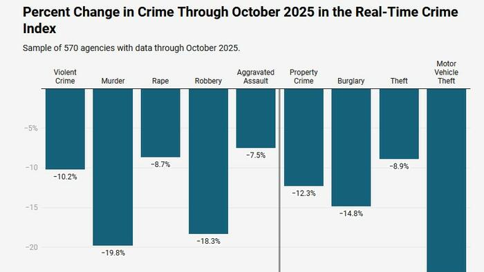 Using the Real-Time Crime Index that compares data from 570 law enforcement agencies, Asher reports a nearly 20% decline in murders in 2025 vs. the same period in 2024. The database excludes manslaughter, self-defense, negligence, or “accidental killings.”