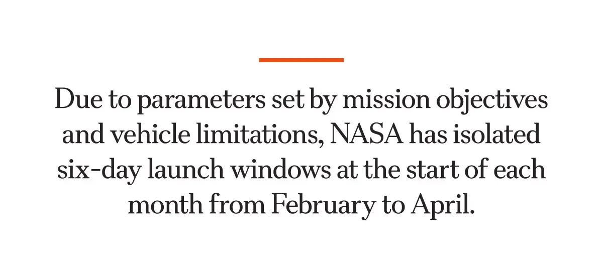 Due to parameters set by mission objectives and vehicle limitations, NASA has isolated six-day launch windows at the start of each month.