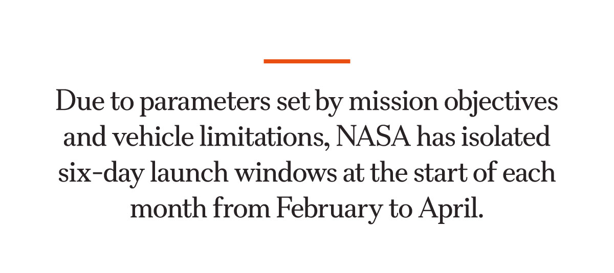 Due to parameters set by mission objectives and vehicle limitations, NASA has isolated six-day launch windows at the start of each month.