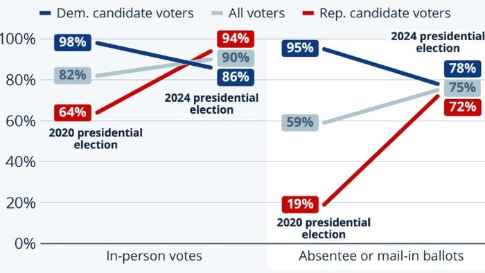 In 2020, just 64 percent of Republican voters were confident that in-person ballots had been counted correctly. This figure shot up to 94 percent when survey participants were asked the same question in 2024 (after Trump won the vote), overtaking the confidence levels of Harris voters. Republican voters were even more skeptical of absentee or mail-in ballots in 2020, with only one in five saying that they were confident that such votes were counted correctly. This jumped to seven in ten (72 percent) in 2024.