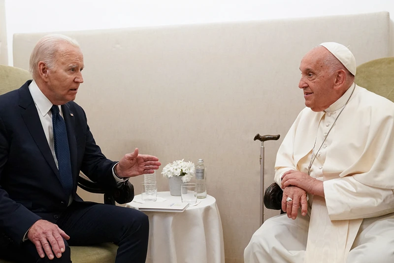 U.S. President Joe Biden meets with Pope Francis on the second day of the G7 summit at the Borgo Egnazia resort, in Savelletri, Puglia, Italy, June 14, 2024. (Photo by KEVIN LAMARQUE/POOL/AFP via Getty Images)