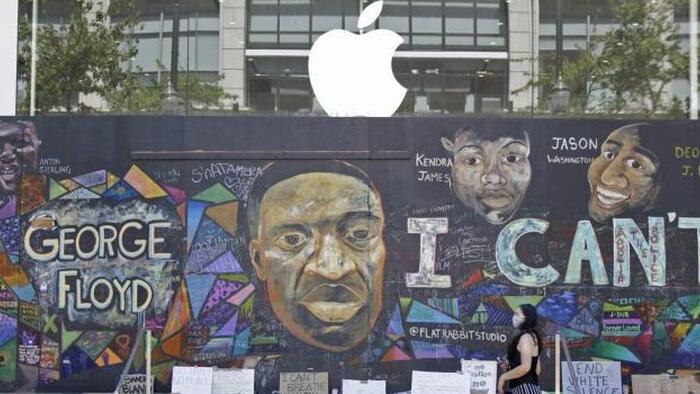 A pedestrian walks past a boarded-up Apple store that’s been covered in street art in downtown Portland, Ore. / PHOTO: AP