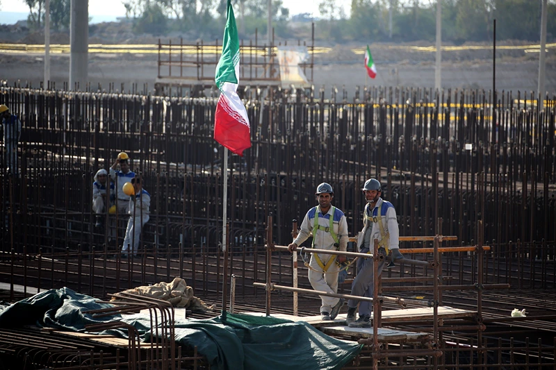 A picture taken on November 10, 2019, shows workers on a construction site in Iran’s Bushehr nuclear power plant during an official ceremony to kick-start works for a second reactor at the facility. (Photo by ATTA KENARE/AFP via Getty Images)