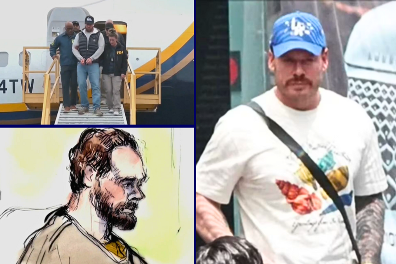 (L-top) Wedding being taken by federal authorities. (Photo screenshot of video via: FBI) / (L-bottom) Courtroom sketch of Ryan Wedding in a federal court in Santa Ana, California, on January 26, 2026. (Photo via: U.S. Attorney’s Office for the Central District of California – DOJ. / (R) A surveillance photo of Ryan Wedding (Photo via: FBI)