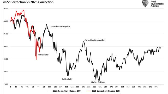 In “Is Risk Off Positioning Signaling A Market Low,” we discussed the extremely oversold market conditions that are beginning to suggest the market may be approaching a near-term low. That analysis was based on various indicators, including extremely negative investor sentiment, positioning, and technical oversold conditions. As we stated, the current market environment is much like 2022. The first chart below shows the 2022 market correction versus 2025. The rally that began this past week could certainly rally further. Still, as we have warned, any rally in the near term will likely be met with sellers until there is a resolution on tariffs, monetary policy, and more certainty around recession risks.